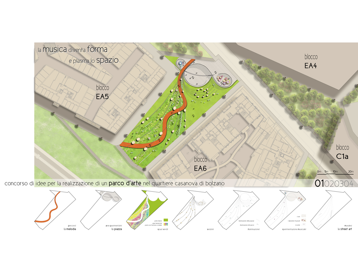 Il progetto immagina la creazione di un piccolo “parco della musica” capace di configurare uno spazio flessibile, interattivo, multifunzionale e gestibile in maniera autonoma dagli abitanti del quartiere Casanova, oltre che, in circostanze particolari, per manifestazioni ed eventi più strutturati. Questo in considerazione del fatto che la musica costituisce uno straordinario promotore di relazioni, sia in caso di fruizione “passiva” (da spettatori), sia in caso di esperienza “attiva” (sperimentando cioè le proprietà del suono nell’ambito di un percorso ludico o didattico).
