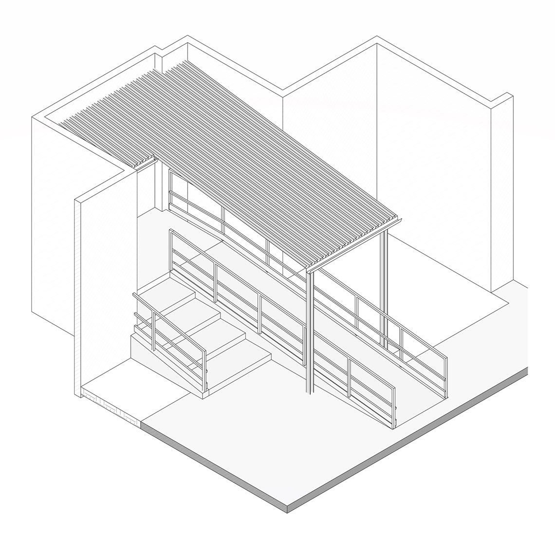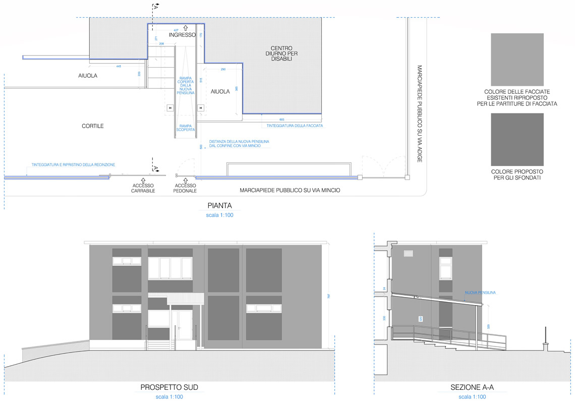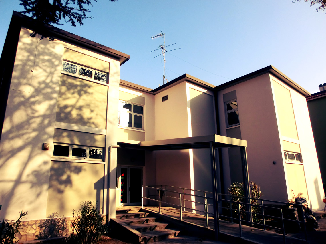 Intervento di risanamento e ritinteggiatura della facciata e della recinzione esterna, con realizzazione di una nuova pensilina in carpenteria metallica a protezione della rampa di accesso per i disabili. Il progetto fa seguito ad un precedente intervento sugli interni del fabbricato.