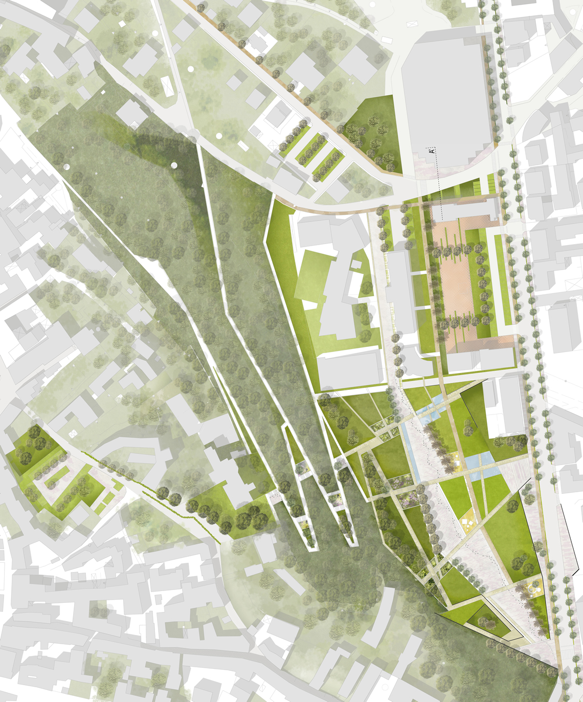 L’obiettivo di progetto è la creazione di una nuova polarità urbana, capace di porsi a sistema con il centro storico consolidato di Avigliana, ma anche di diventare un attrattore attorno al quale riorganizzare gli ambiti periferici meno strutturati attraverso la creazione di una rete ecologica a livello territoriale.
