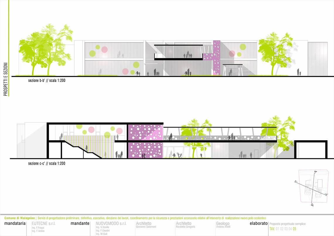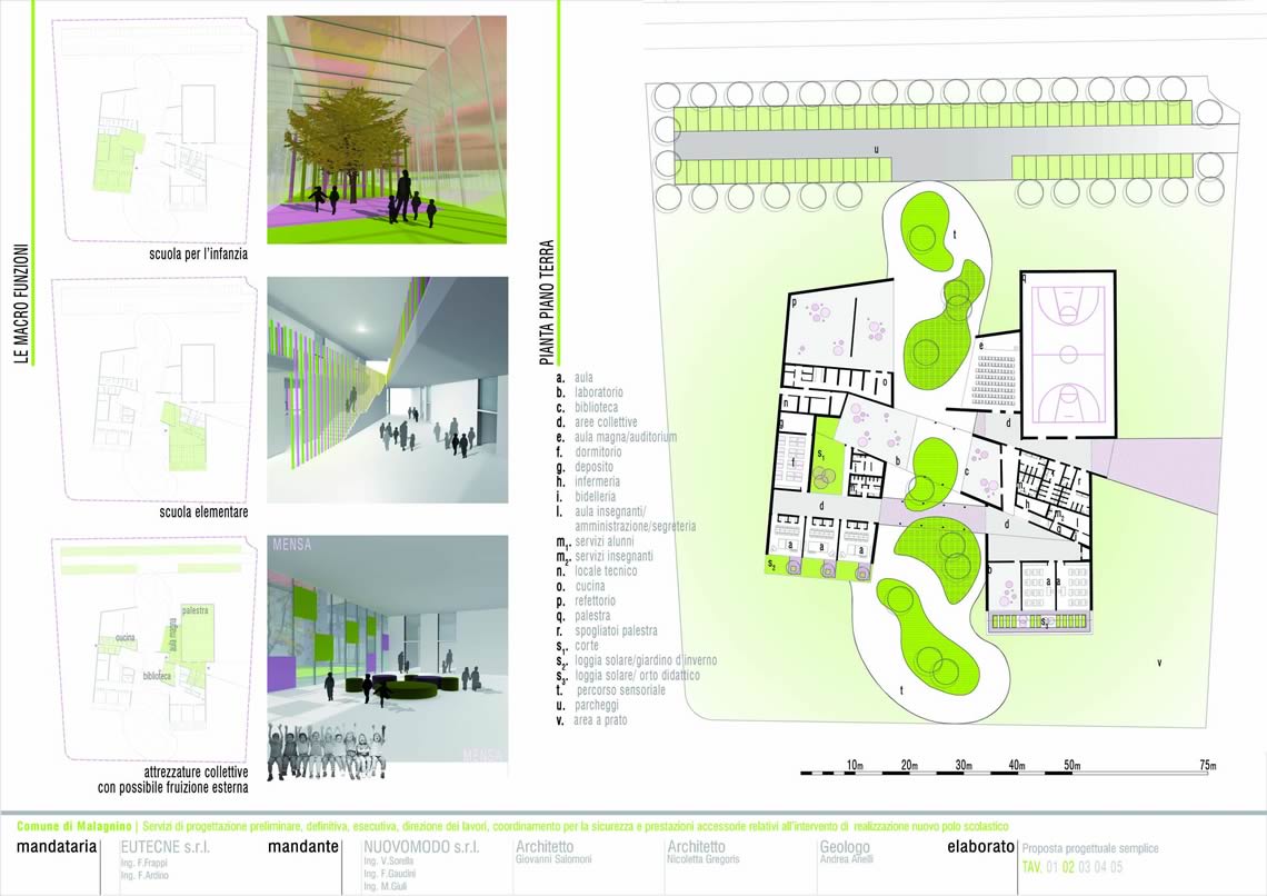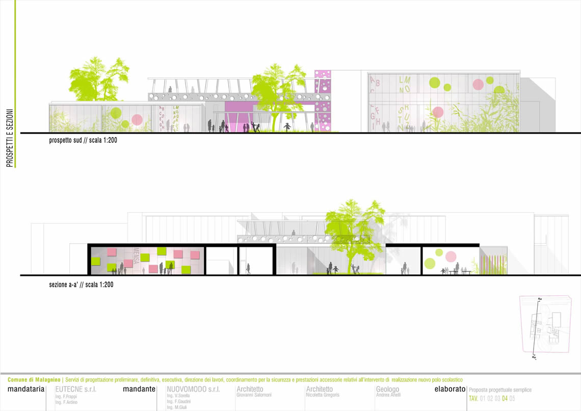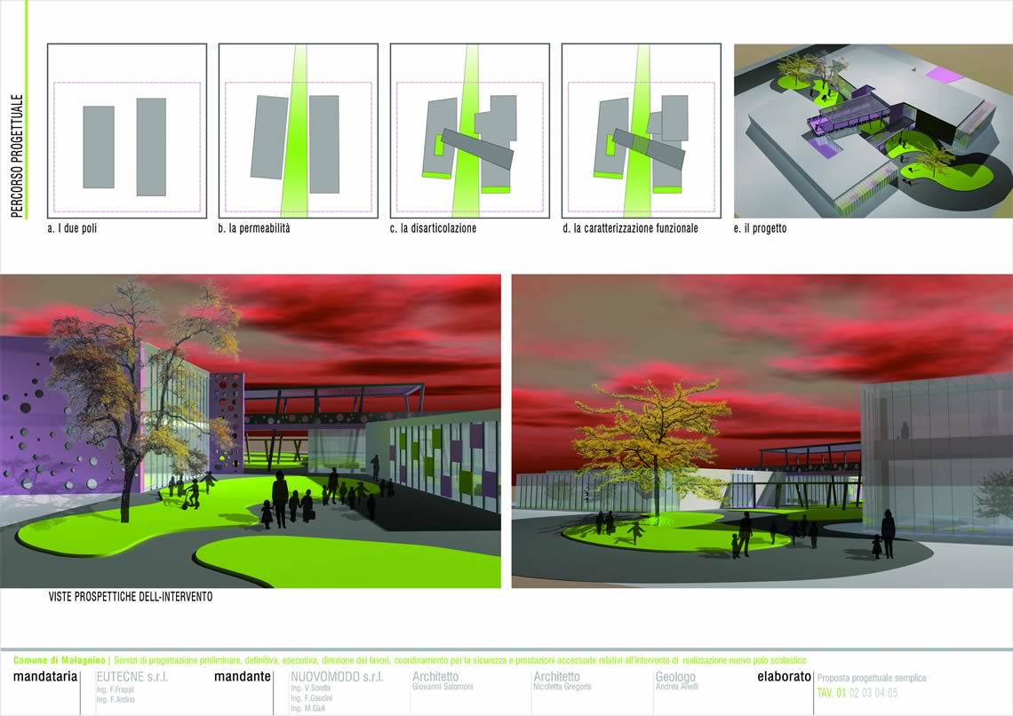 Progetto per un nuovo polo scolastico composto da scuola materna, elementare, palestra, biblioteca e auditorium da realizzare a Malagnino (CR). Il concept dell’edificio risponde all’obiettivo di realizzare spazi “a misura di bambino”, dove la varietà delle forme, dei materiali e dei colori induca a percepire la scuola non come un luogo “coercitivo” o “concentrazionario”, quanto piuttosto come un ambiente di incontro, di aggregazione e scoperta, in cui anche l’aspetto ludico trovi la sua giusta dimensione.