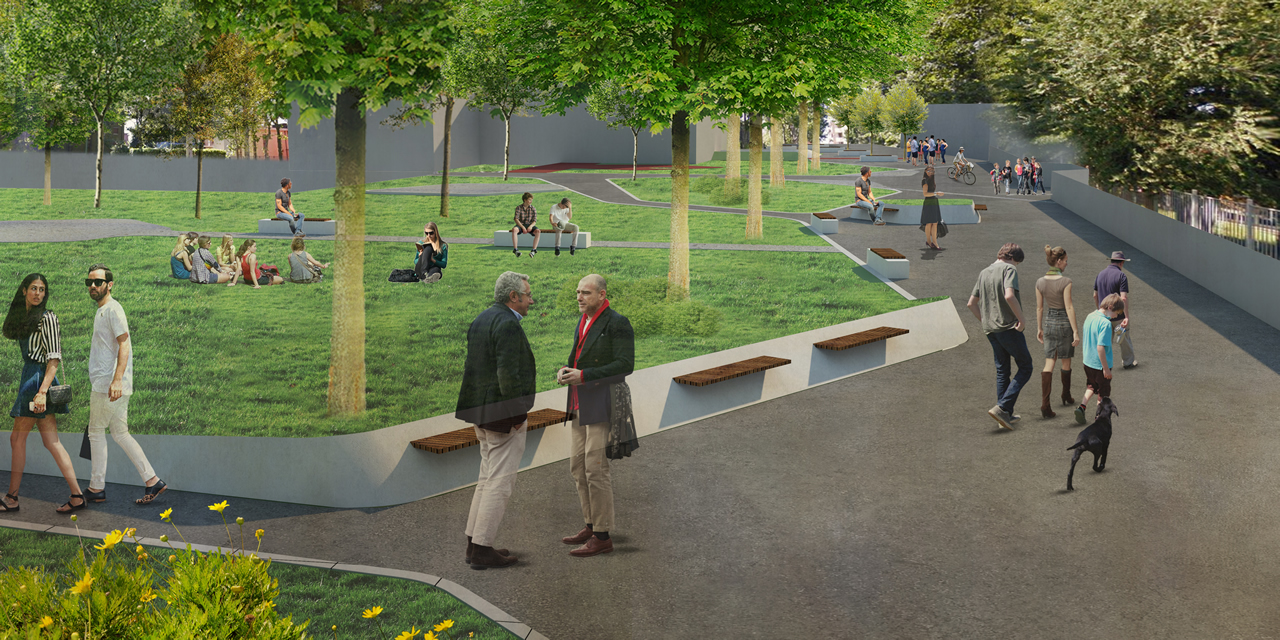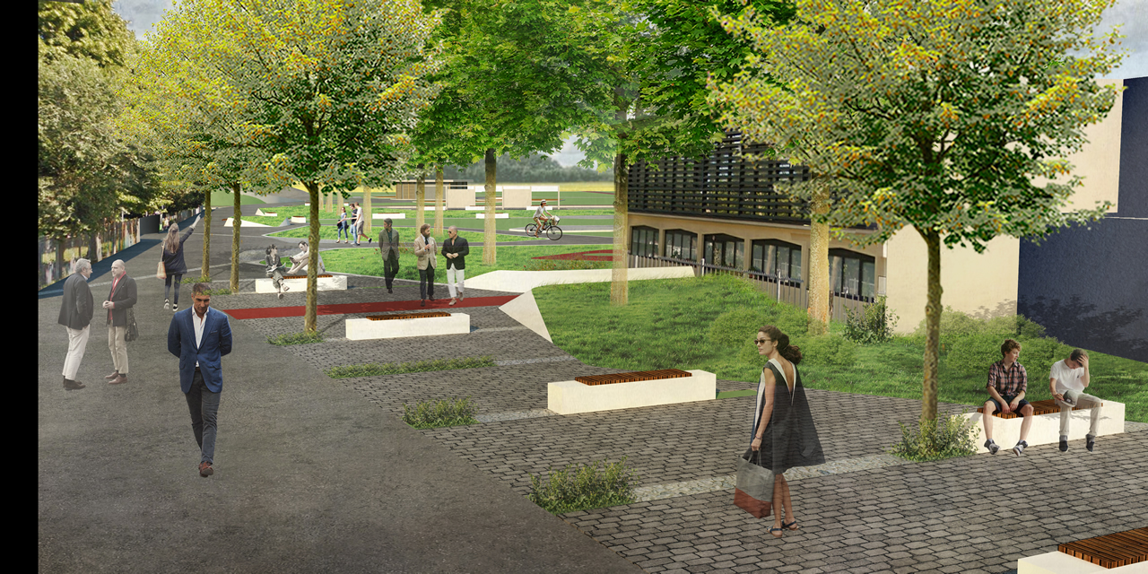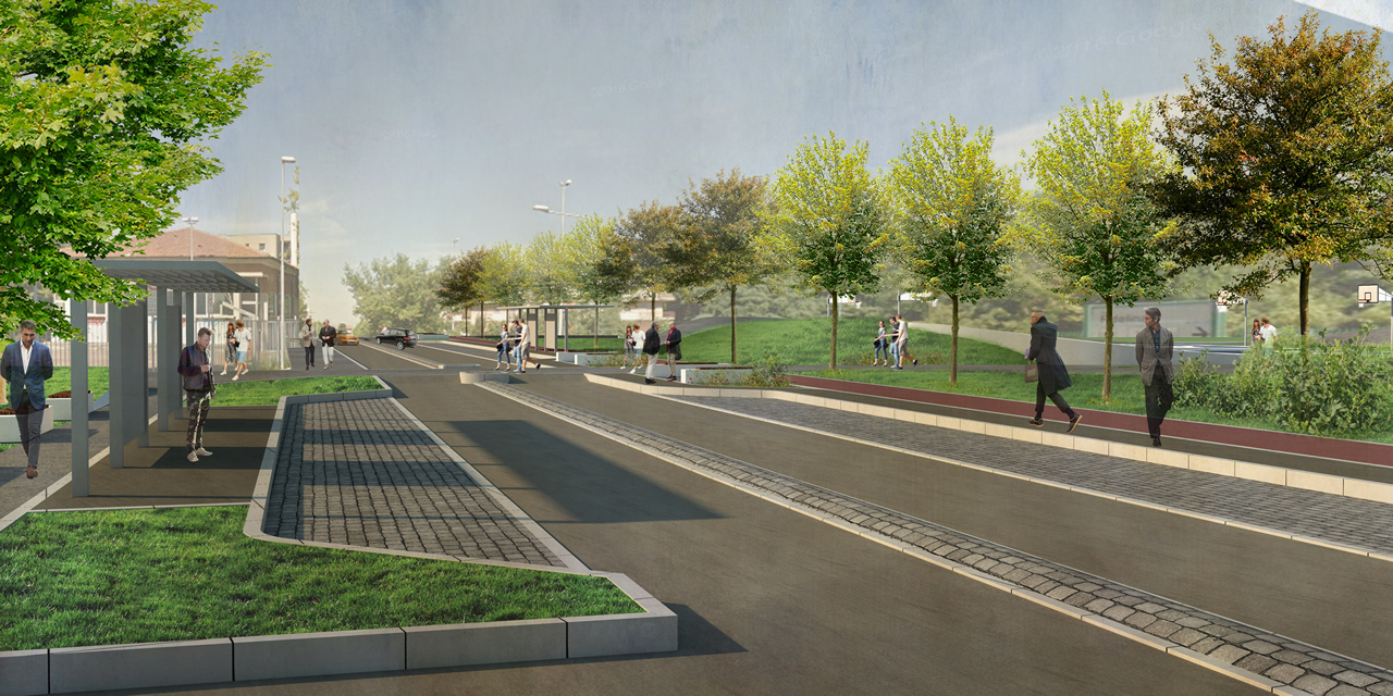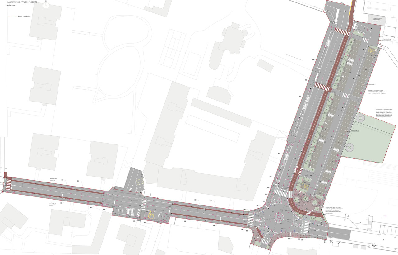 Il primo ed il secondo lotto riguardano in prevalenza la sistemazione di spazi stradali, tramite interventi di riorganizzazione della sosta, realizzazione di nuovi percorsi ciclopedonali, caratterizzazione degli spazi aperti, attuazione di mitigazioni e contestualizzazioni paesaggistiche, nell’ambito di un preciso “disegno del suolo” teso ad assicurare la massima continuità con l’attiguo centro storico e la migliore leggibilità dei diversi ambiti funzionali (sedimi carrabili, ibridazioni e attraversamenti, ciclopiste, marciapiedi, ecc.). L’intervento è accompagnato da un progetto di invarianza idraulica ai sensi del Regolamento Regionale 7/2017.